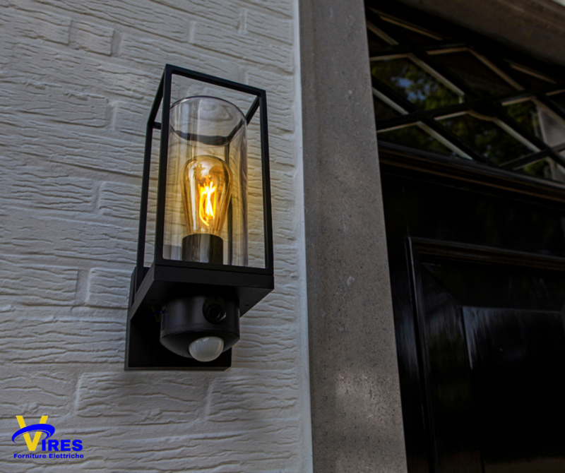 Applique lanterna moderna con lampadina E27 (non inclusa) e telecamera incorporata. Il sensore di movimento ha un raggio fino a 18 metri di distanza. La telecamera HD permette una definizione elevata e la scheda SD di 16 GB (inclusa) permette di registrare e archiviare i video. L'installazione è facile e veloce e l'accoppiamento del dispositivo si esegue tramite Bluetooth e Wi-Fi. Microfono incorporato e altoparlante 2 vie. Per esterno IP44.